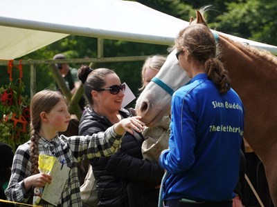 Na de demo is James nog door heel veel kinderen en volwassenen geaaid terwijl hij in zijn paddock stond. Hij kon altijd weg maar vond alle aandacht wel interessant. In de middag konden mensen intekenen voor een half uurtje boogschieten op de grond, we begonnen met een groep en hadden binnen de kortste keren drie volle groepen. We kregen regelmatig te horen dat mensen het jammer vinden de demo te hebben gemist dus misschien volgend jaar ook nog maar een korte demo in de middag met James!