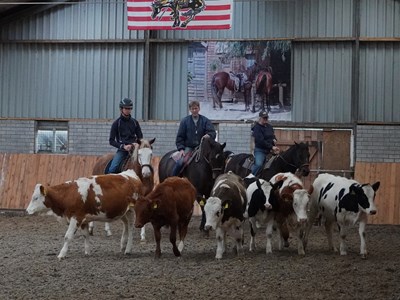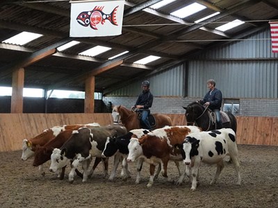 Ik train James in de Californian Vaquero stijl. In mei volgde ik hiervoor een clinic van Jeff Sanders. Vorige week trainde ik met James drie dagen in Bantega bij Ben en Loes, die ook de clinics met Jeff Sanders organiseren. De laatste dag trainden we ook met koeien. Het mooie is dat je daarbij alles wat je gewoon traint, kunt en moet gebruiken om goed met de koeien te kunnen werken. Dat kun je misschien ook wel in het filmpje zien dat ik hierbij plaats. Ook kun je zien dat wij absoluut niet op de koeien jagen maar juist vanuit rust met hen werken.
