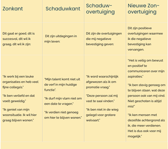 - De Zonkant: In deze kolom schrijf je alles wat er goed gaat in je leven. Wat is er succesvol? Waar ben je goed in? Wat wil je graag? Wie wil je zijn? Ga net zo lang door, tot je niets meer kunt bedenken.